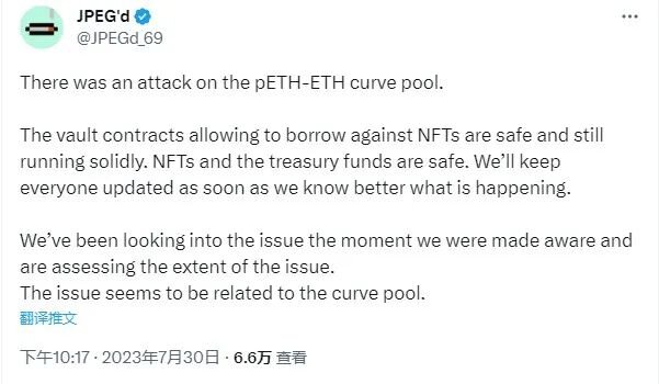 7月30日晚间,一则“不太起眼”的新闻出现,NFT借贷平台JPEG’d称其在Curve Finance上的pETH- ETH流动性池遭到攻击,其他NFT、合约和金库资产安全。