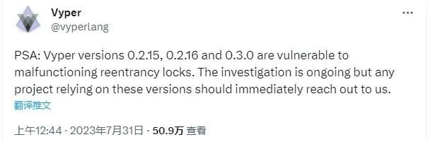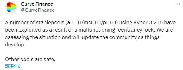 然而一波未平一波又起,短短几个小时后,7月31日凌晨,加密社区传出多个Curve流动性池遭到攻击,随后DeFi协议CurveFinance官推发布声明,由于递归锁出现故障,许多使用Vyper0.2.15的稳定币池(alETH/msETH/pETH)遭到攻击,并称其团队已经在评估情况,并将随着事态发展向社区通报最新情况。