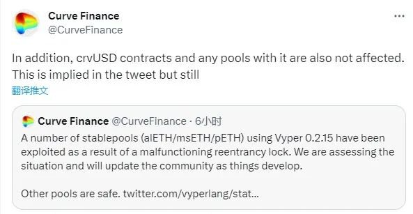 Curve Finance很快就跟进确认,本次事件只对使用Vyper版本和“纯”ETH的用户有影响,并且重申对crvUSD合约本身以及其他流动性池没有影响。