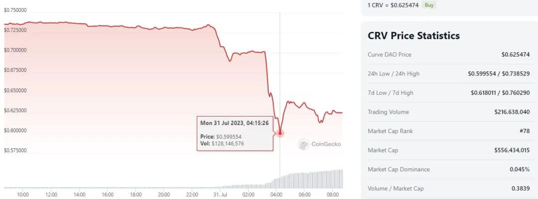 受攻击事件影响,Curve DAO的原生代币CRV价格一度跌至0.59美元,目前报0.62美元,24小时跌幅高达15%。